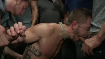 Short-haired lad is on his knees and he gets gangbanged