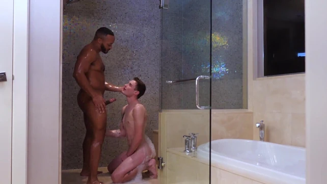 Muscular lover welcomes his roommate in the shower with him for some sex
