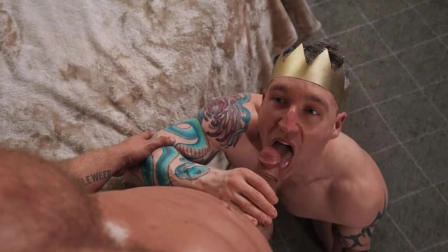 Tattooed lad wearing a crown while feasting on a big dong